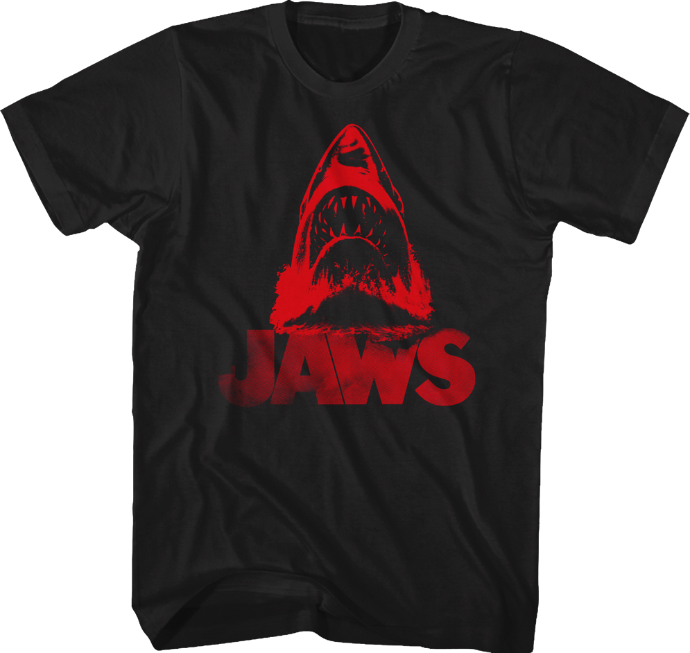 This Red Shark Jaws T-Shirt shows a blood-red image great white shark jumping from the water to attack its next victim above the movie's logo. In the movie Jaws, a giant shark terrorized Amity Island and made the movie one of the most terrifying cinematic experiences of all time!