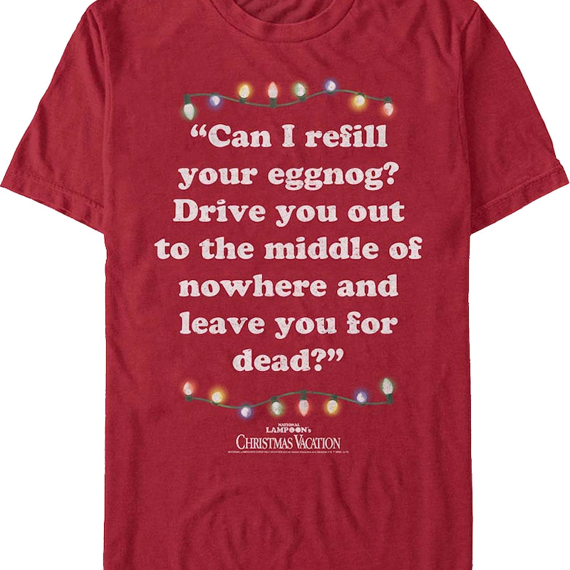The interaction between Cousin Eddie and Clark Griswold made Christmas Vacation one of the greatest holiday movies of all time. Everyone will instantly know you are a fan when you wear this Refill Your Eggnog Christmas Vacation T-Shirt!