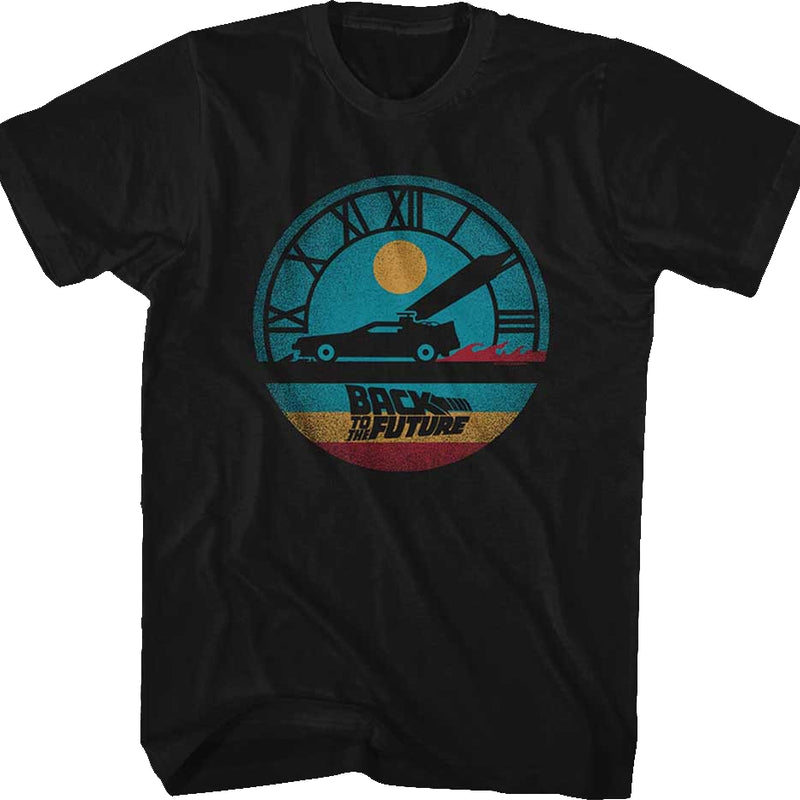 This Back To The Future t-shirt features a silhouette of Doc Brown's DeLorean in the clock of the Hill Valley clock tower.