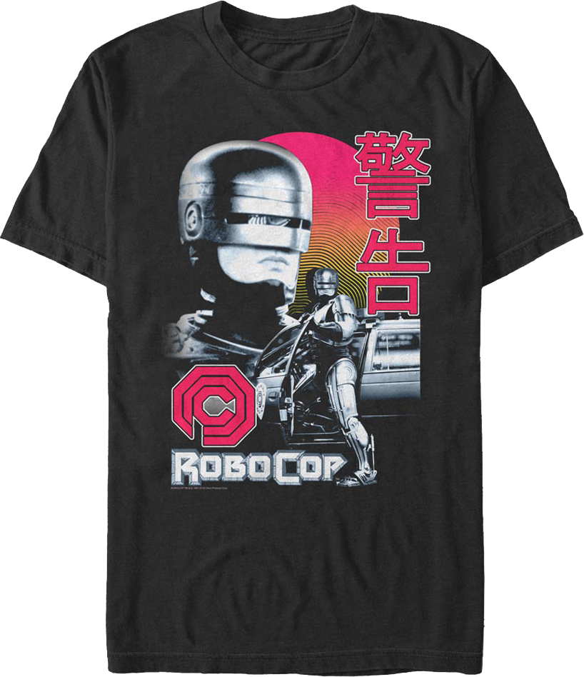 In Robocop, an evil corporation wins a contract from the city of Old Detroit to privatize the police force. To test their crime-eradicating cyborgs, the company leads street cop Alex Murphy into an armed confrontation with crime lord Boddicker so they can use his body to support their untested Robocop prototype. But when Robocop learns of the company's nefarious plans, he turns on his masters. Everyone will know you are a fan of the 1987 classic when you wear this Retro Collage Robocop T-Shirt!
