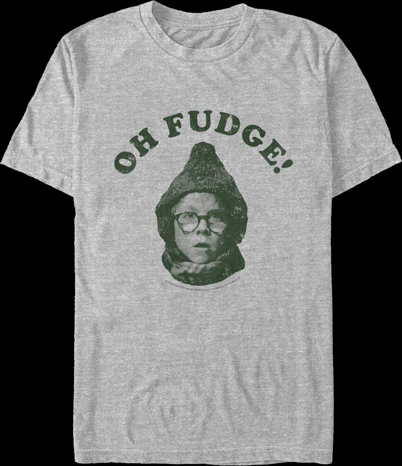 This Christmas Story t-shirt features a distressed image of Ralphie Parker. The shirt shows Ralphie's famous quote, "Oh, Fudge!"