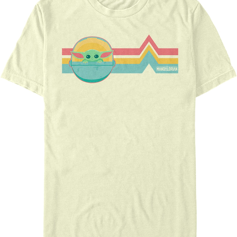This Star Wars t-shirt shows "The Child" in his bassinet, positioned in front of colorful, pointed stripes.