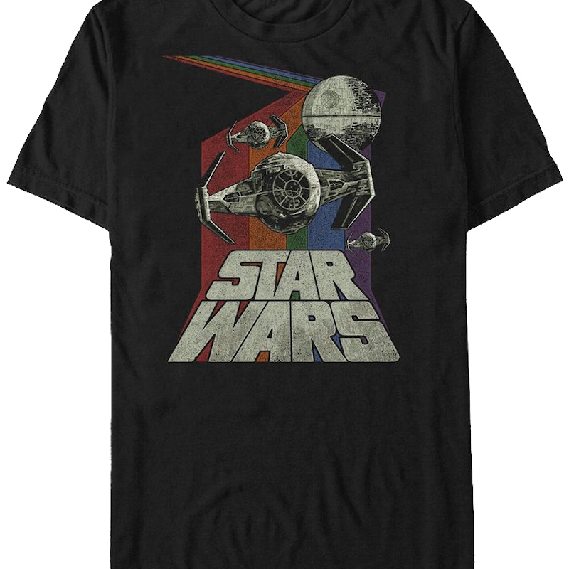 This Star Wars t-shirt features three TIE Fighters flying close to the Darth Star. The shirt is distressed and includes retro colors, made to look like you've been wearing this shirt since you first saw a Star Wars movie.