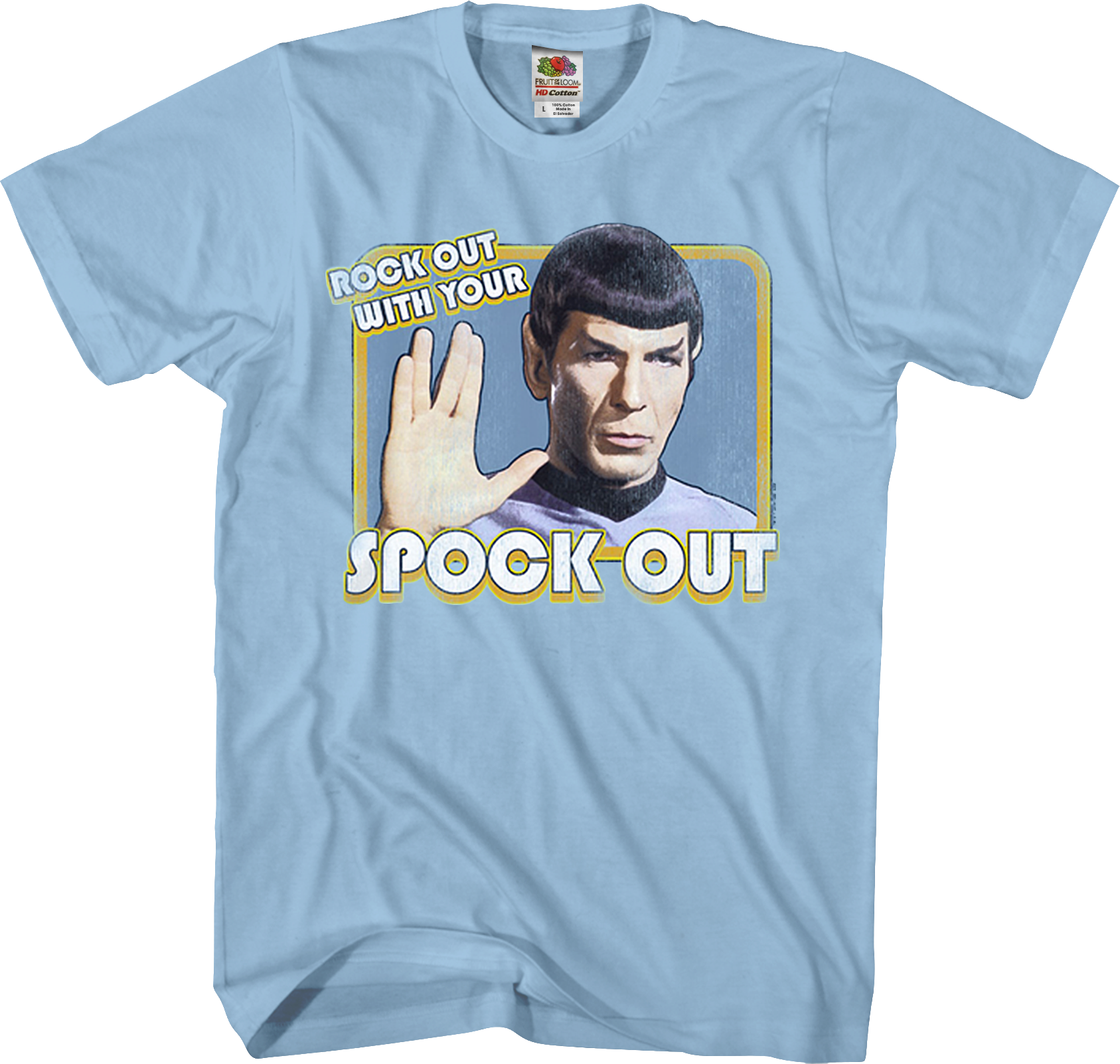Expose your inner Vulcan for all the world to see! This Star Trek t-shirt features an image of Spock giving the Vulcan Salute, along with a message encouraging you to "Rock out with your Spock out."