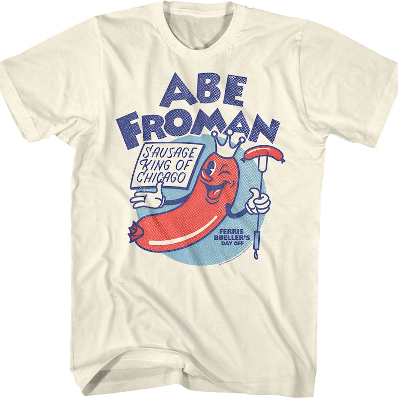 This Ferris Bueller's Day Off t-shirt features a sausage link mascot for Abe Froman, who is the Sausage King of Chicago.
