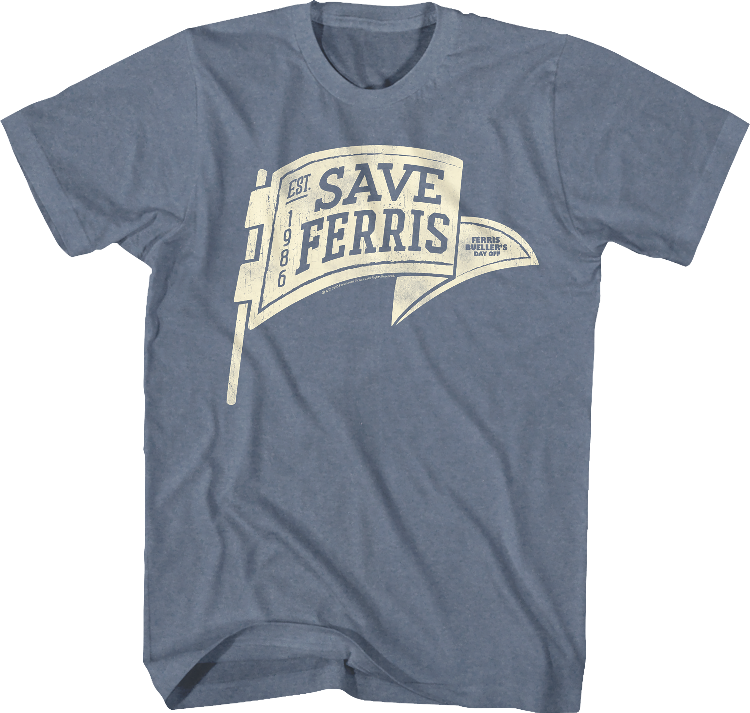 This Ferris Bueller's Day Off t-shirt features a pennant that reads "Save Ferris". This slogan became a became a call to action for people to show their support for Ferris, who they thought was sick and dying.