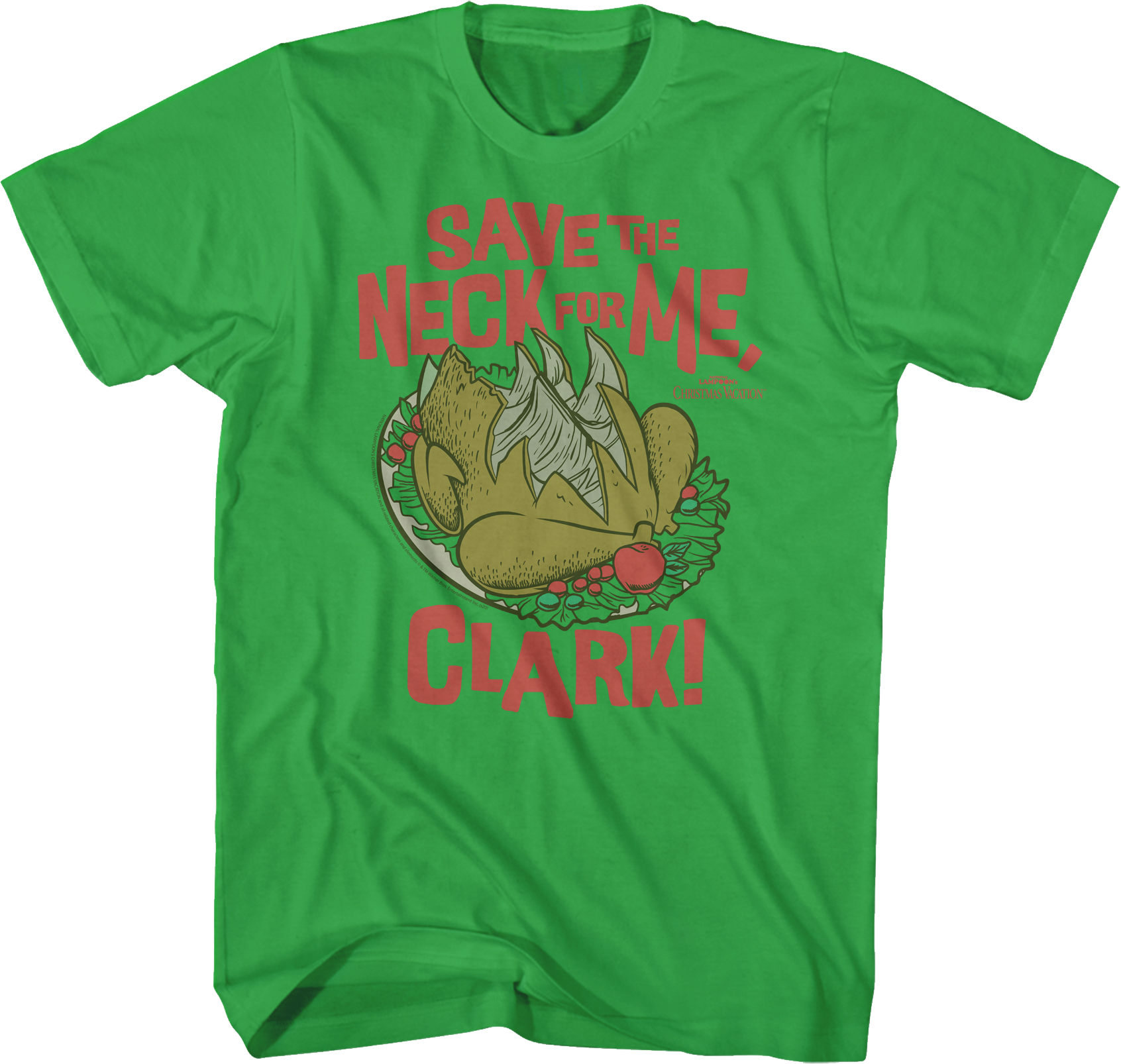 In National Lampoon's Christmas Vacation, Cousin Catherine made a turkey dinner. When Clark Griswold cut the turkey open on the Griswold's dining room table, it was just a little dry. Cousin Eddie was unphased by the turkey, and he said, "Save the neck for me, Clark!" This is one of the most memorable scenes from Christmas Vacation. Everyone will know you are a fan of the hilarious holiday classic starring Chevy Chase when you wear this Save The Neck For Me Clark Christmas Vacation T-Shirt!