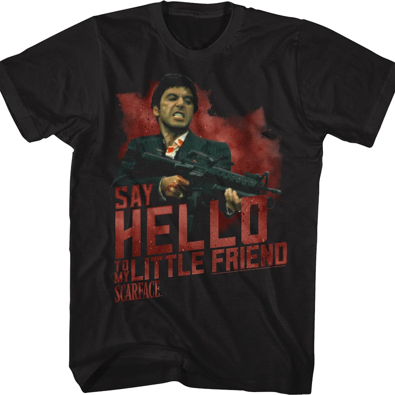 The 1983 film Scarface features one of the most iconic climactic scenes in cinematic history. With an M16A1 in hand, Tony Montana said the now famous words "Say Hello To My Little Friend". That scene is illustrated on this Scarface t-shirt, with Tony Montana pointing his gun, and the shirt includes his unforgettable quote.