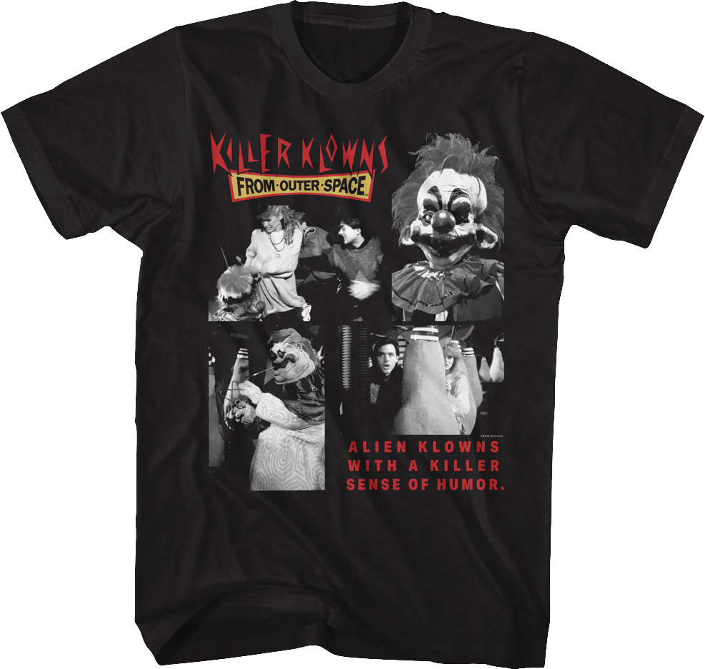 This Killer Klowns From Outer Space t-shirt features black and white images from the 1988 cult classic. The shirt reads "Alien Klowns With A Killer Sense Of Humor."