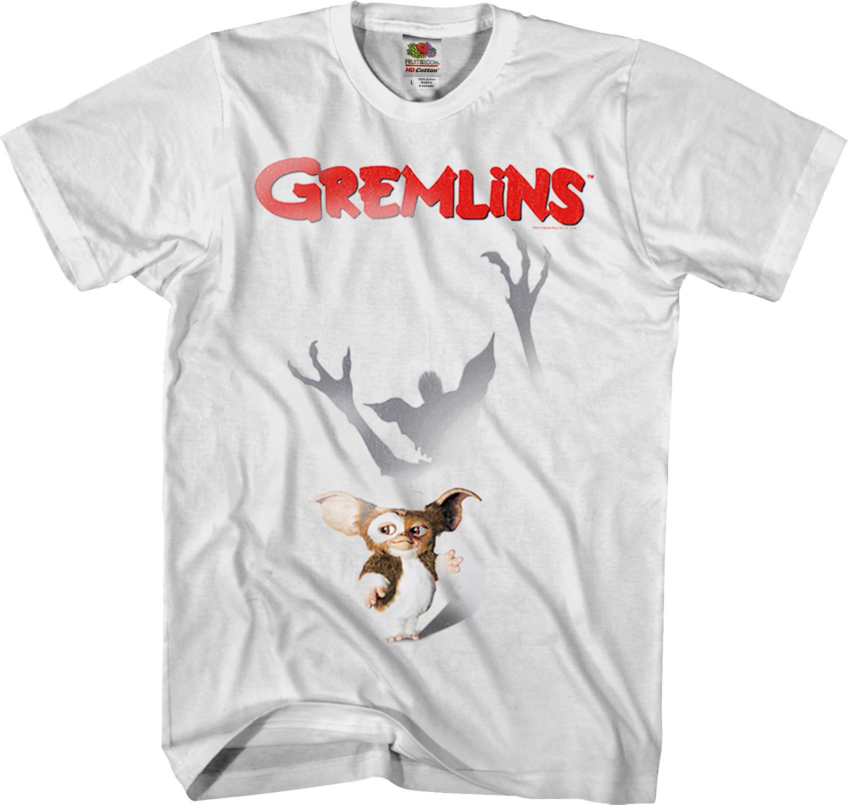 This Gremlins t-shirt features a movie poster that shows Gizmo standing in the shadow of the mischievous gremlin Stripe.