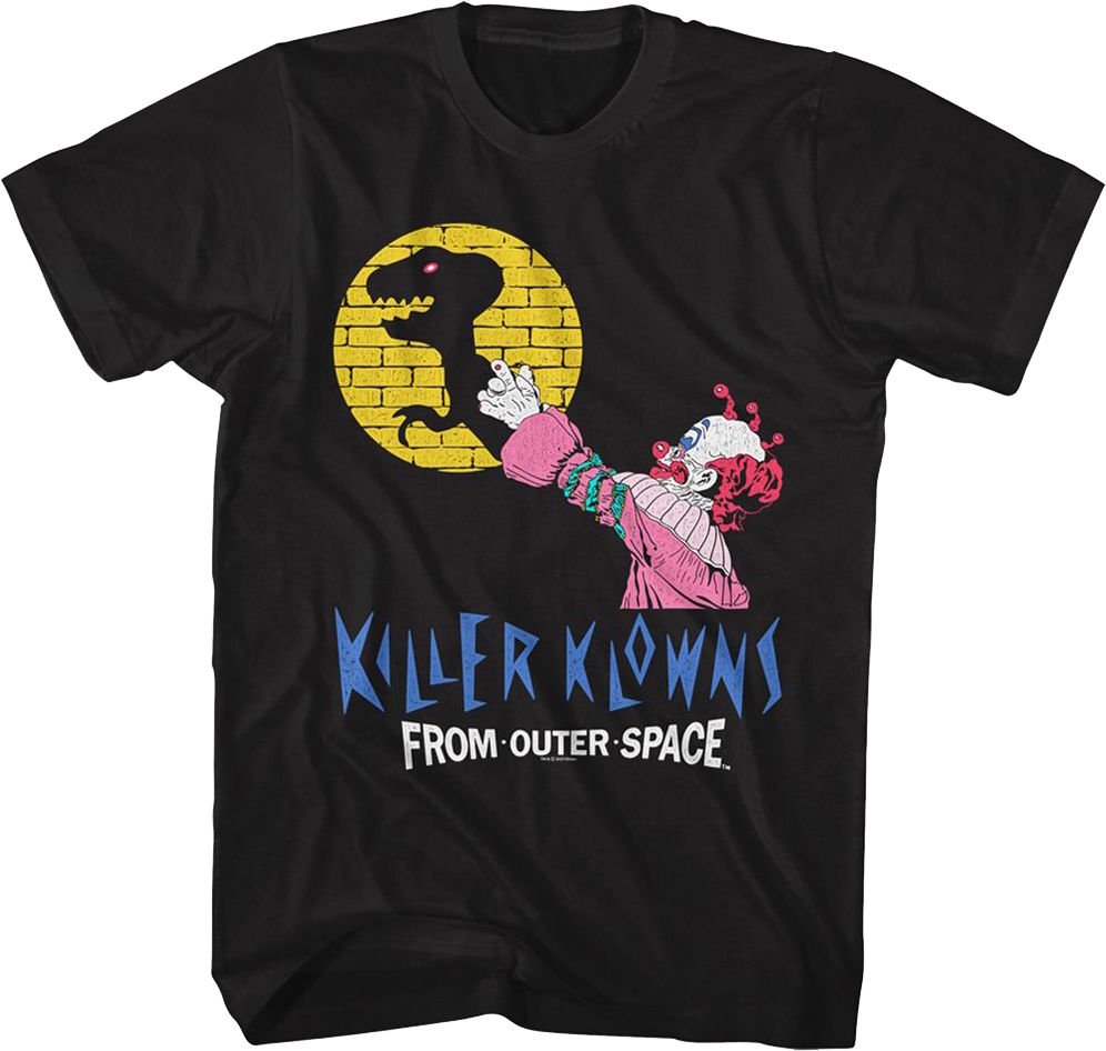 This Killer Klowns From Outer Space t-shirt features an image of Slim, a clown whose special talent is using shadow puppets.