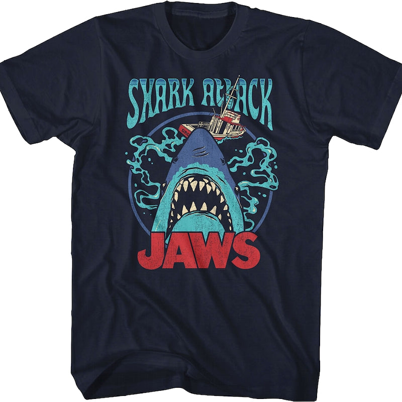 This Jaws t-shirt shows a great white shark ready to attack Quint's Orca boat.