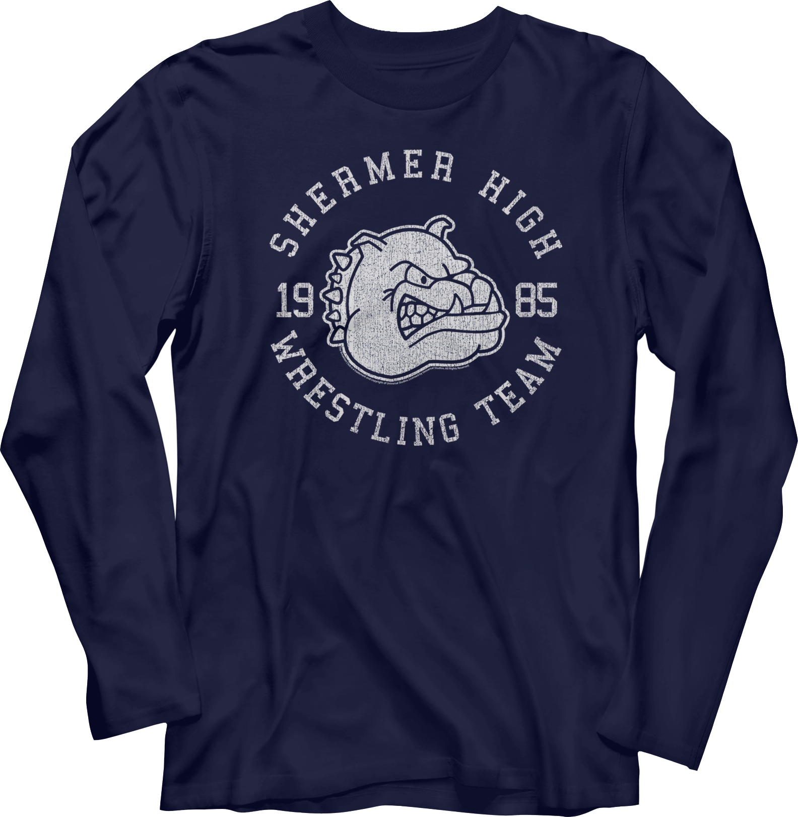 This Breakfast Club long sleeve shirt features the Shermer High bulldog mascot, and the shirt reads Shermer High 1985 Wrestling Team.