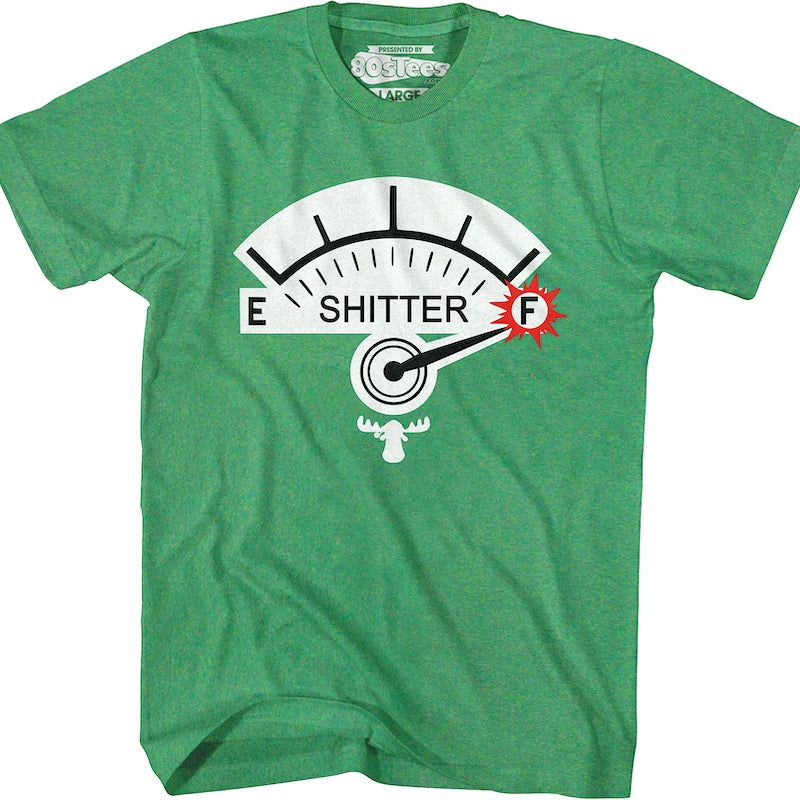 This 80sTees.com exclusive Christmas Vacation t-shirt shows a Marty Moose gas gauge labeled "Shitter" pointing to Full.