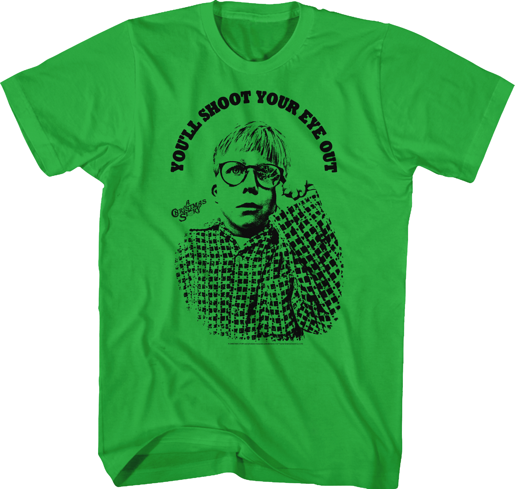 He was told numerous times, but Ralphie just wouldn't listen in the holiday classic A Christmas Story. Everyone told Ralphie that he would shoot his eye out with a Red Ryder carbine action 200-range-shot model air rifle. This Christmas Story t-shirt shows an image of Ralphie with his broken glasses and the shirt reads You'll Shoot Your Eye Out. This is the perfect t-shirt for any fan of A Christmas Story.