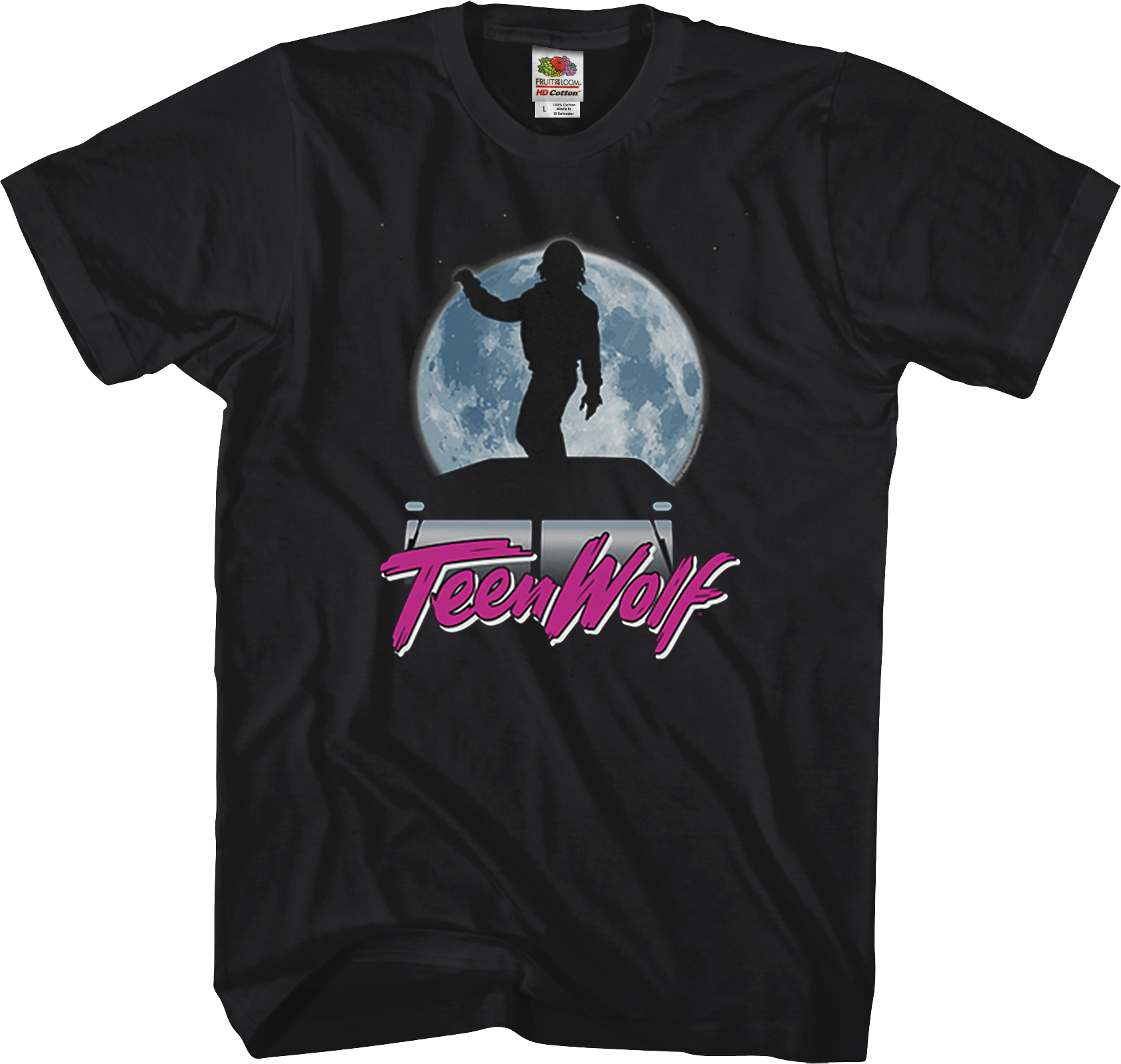This Silhouette Teen Wolf T-Shirt features an image of Scott Howard in wolf form van surfing in front of a full moon. In the 1985 comedy, Teen Wolf, Scott found that he had new powers when he turned into a wolf, like standing on top of his friend Styles' van while pretending to surf to the Beach Boys song "Surfin' USA".