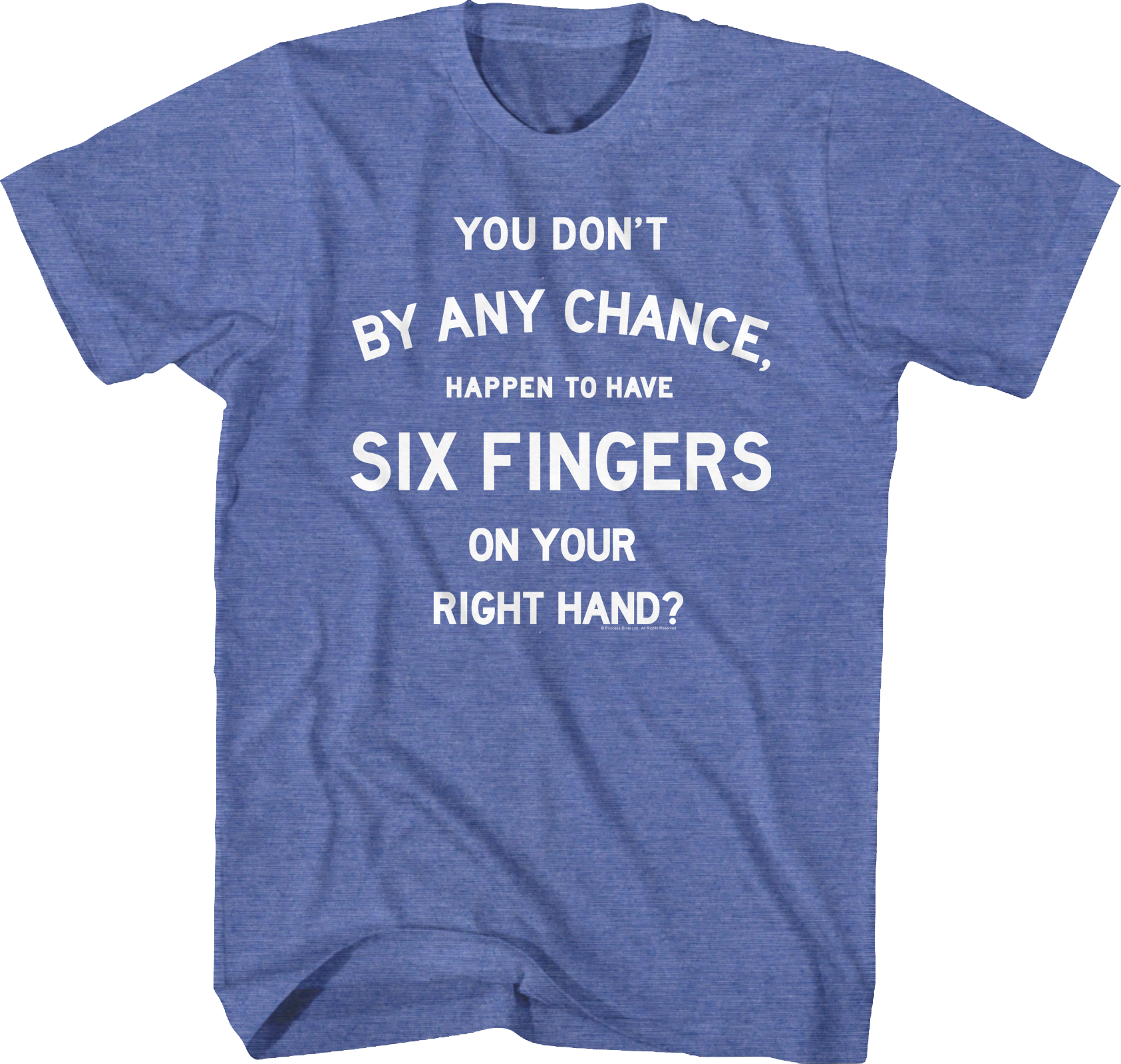 This Princess Bride t-shirt shows the question that Inigo Montoya asked the Man in Black just before their duel, "You Don't By Any Chance, Happen To Have Six Fingers On Your Right Hand?"