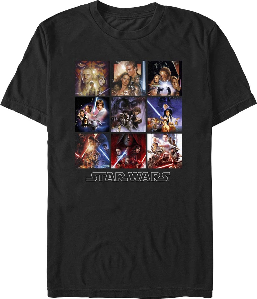 This Star Wars t-shirt features the movie posters for the Skywalker Saga. These posters include Episode I The Phantom Menace, Episode II Attack of the Clones, Episode III Revenge of the Sith, Episode IV A New Hope, Episode V The Empire Strikes Back, Episode VI Return of the Jedi, Episode VII The Force Awakens, Episode VIII The Last Jedi, Episode IX The Rise of Skywalker.