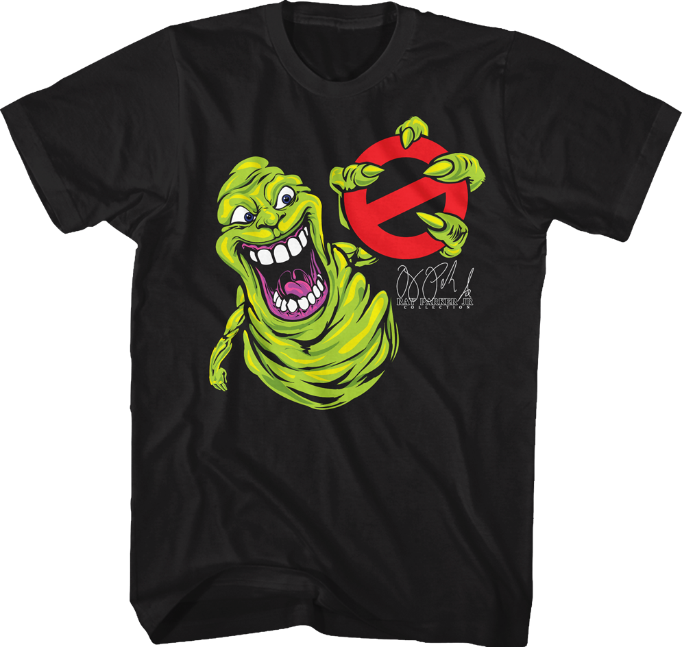 Slimer is seen clutching the Ghostbusters no-ghost logo. This shirt is part of the Ray Parker, Jr. Collection and includes Ray Parker Jr.'s autograph.