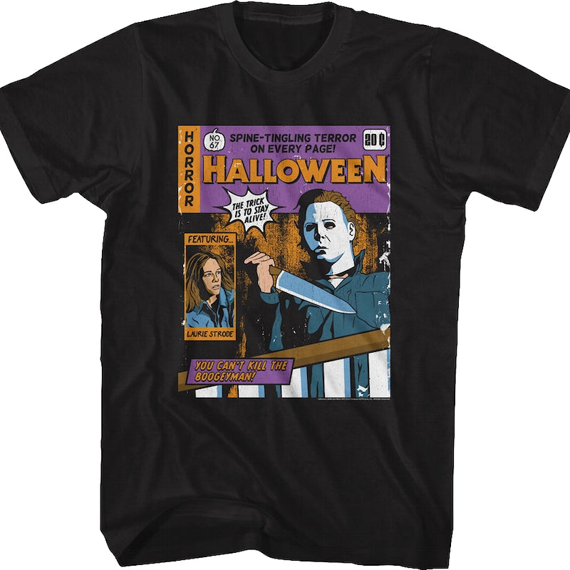 For any fan of John Carpenter's terrifying classic, this Spine-Tingling Comic Book Cover Halloween T-Shirt is a must have!