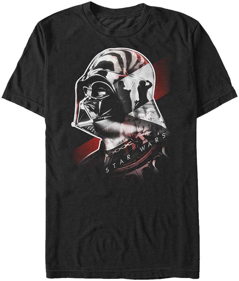 This Star Wars Darth Vader Collage T-Shirt shows a collage reflected on Vader's helmet. The images include X-Wing and TIE Fighters, the lightsaber battle with Luke, and the Storm Trooper Army.