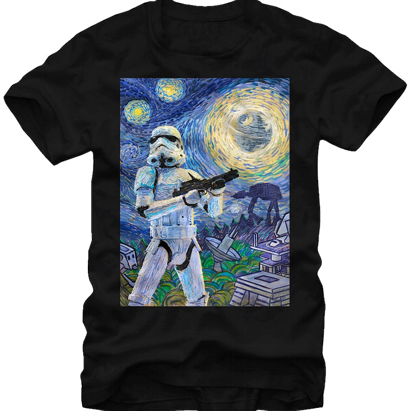 Two pop culture icons come together on this Star Wars t-shirt, as the greatest movie franchise of all time appears on the most decorated oil canvas painting of all time. Vincent van Gogh's masterpiece The Starry Night joins the Dark Side, as it includes images of a Stormtrooper, an AT-AT, the Death Star, an AT-ST and Imperial weapons on this Stormy Night t-shirt. The Stormtrooper is one of the most recognizable characters from Star Wars, and The Starry Night is among the most well-known paintings, making this a shirt that will easily catch the eye of everyone that sees you wearing it. For any fan of Star Wars, this Stormy Night t-shirt is a priceless work of art.