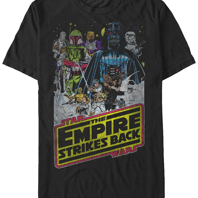 This shirt shows Luke Skywalker, Princess Leia, C-3PO, Darth Vader, Boba Fett, Bossk, a Stormtrooper, Chewbacca, Han Solo and R2D2.