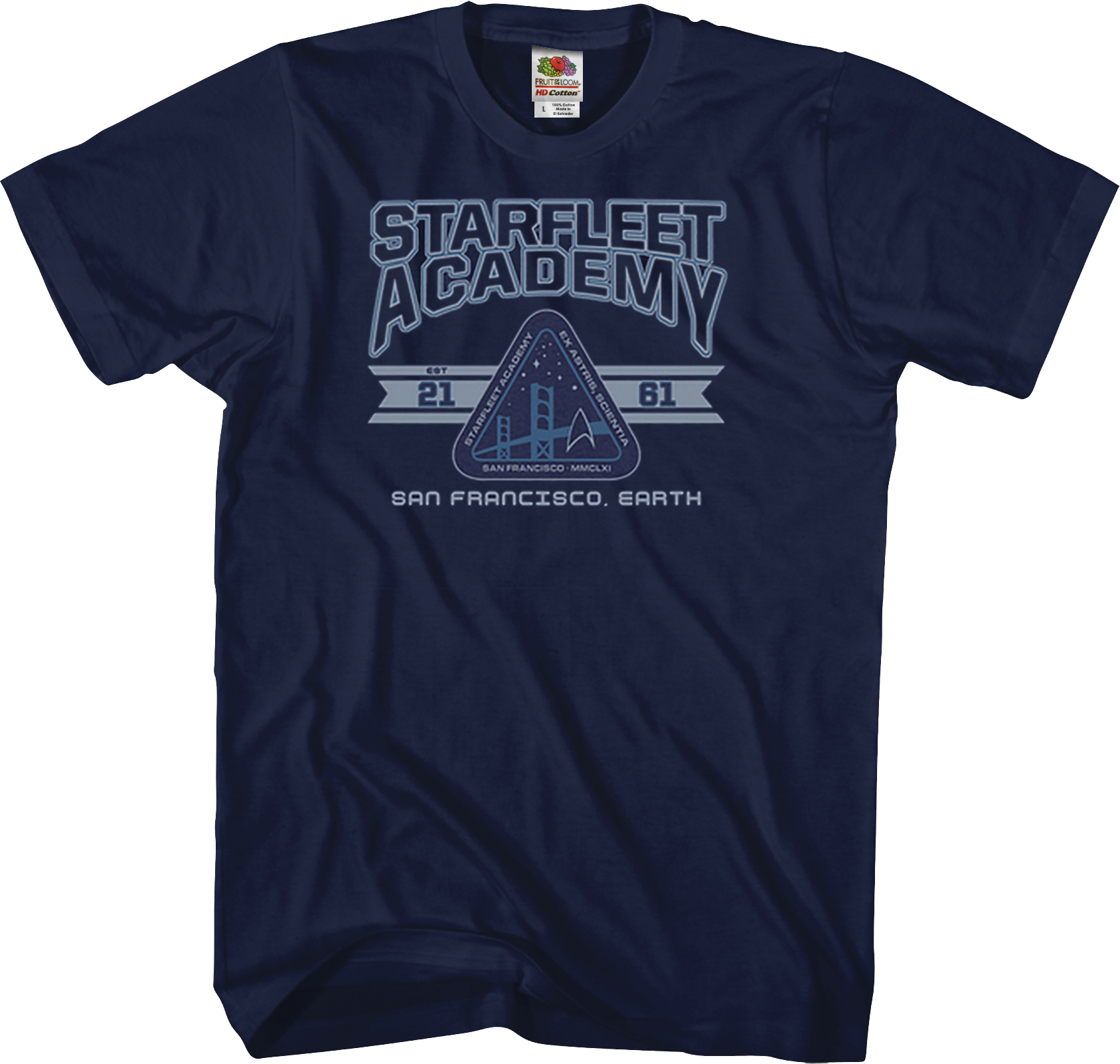 In the year 2161, when the United Federation of Planets is formed, Starfleet Academy will train future Starfleet officers at its campus near San Francisco, California. The Academy's motto is Ex astris, scientia, which translates to From the stars, knowledge. For anyone who hopes to one day go where no man has gone before, they must first attend Starfleet Academy. Show your support for the Academy with this Star Trek shirt. If you'd rather not attend the San Francisco campus, there is another one in Marseille, France. Tell them Boothby sent you.