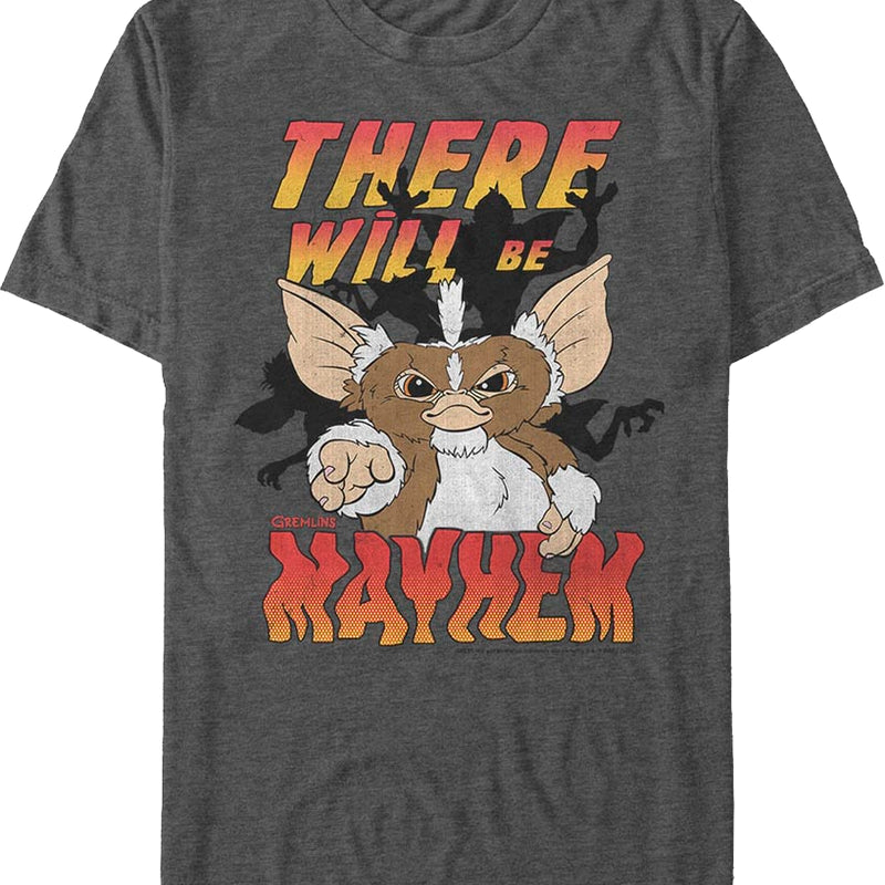 This Gremlins t-shirt shows Stripe as a young mogwai and silhouettes of fully grown gremlins in the background. The shirt reads There Will Be Mayhem.