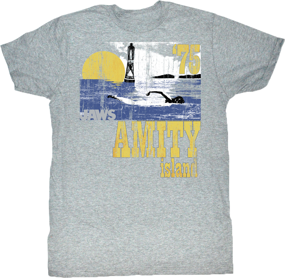 In 1975, Amity was known for "friendship". That was, until someone decided to go for a moonlit swim. Then, Amity Island was known for its little carcaradon carcharias problem. If only someone would have yelled shark instead of barracuda. This Jaws shirt shows the famous opening swimming scene from the timeless classic.