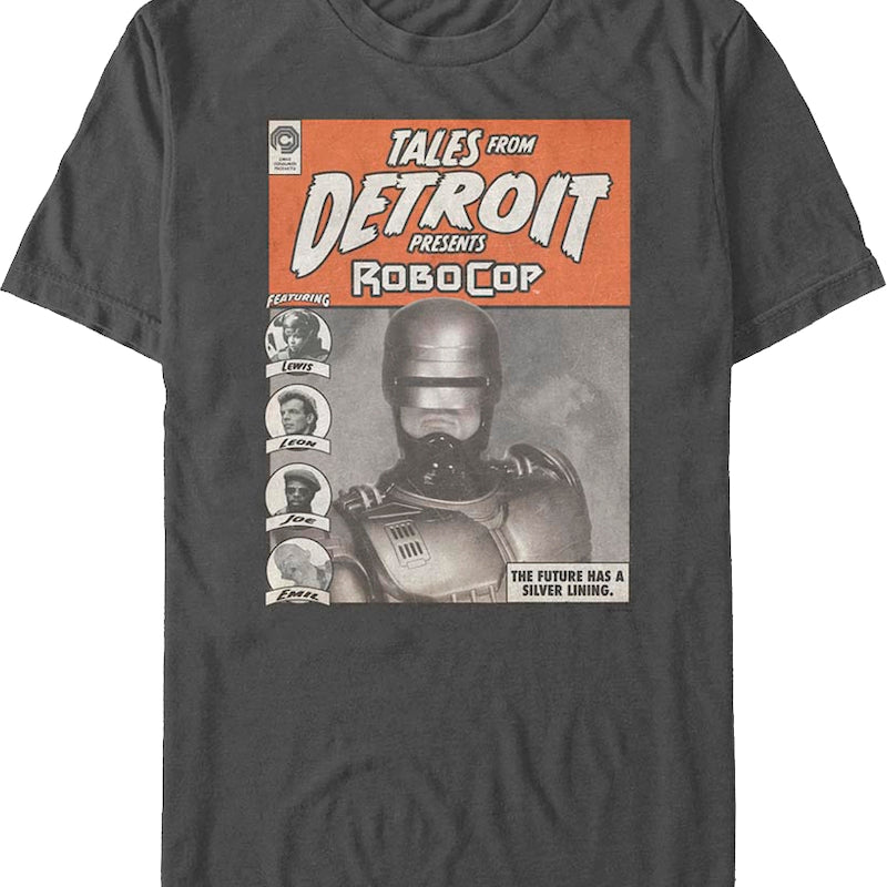 This Robocop t-shirt shows Robocop, Anne Lewis, Leon Nash, Joe Cox, and Emil Antonowsky on the cover of a comic book titled Tales From Detroit.