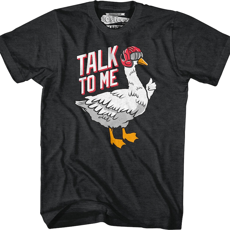 This 80sTees.com exclusive Top Gun t-shirt shows a goose giving a thumbs up and wearing Nick "Goose" Bradshaw's flight helmet. The shirt reads Talk To Me - followed by the picture of the goose. "Talk to me, Goose" is one of the most famous quotes from the hit 1986 movie Top Gun.