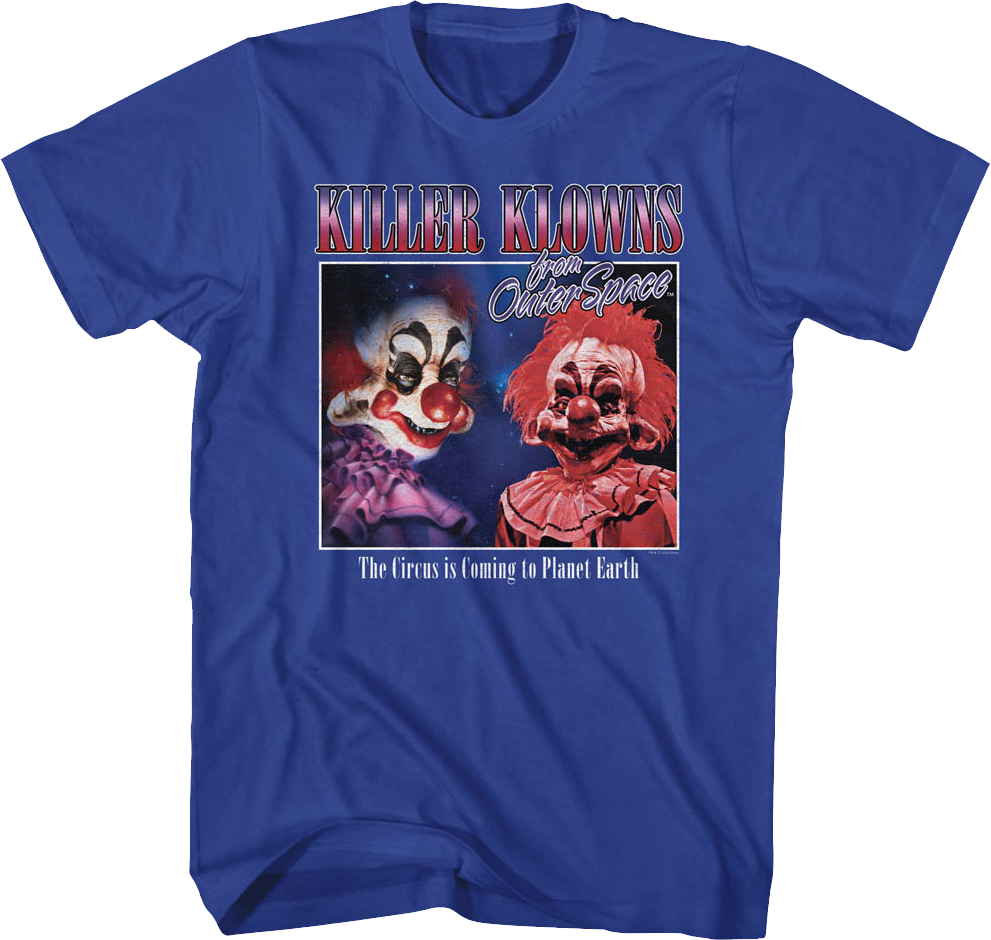 This Killer Klowns From Outer Space t-shirt features an image of the klowns Rudy and Magori. The shirt includes the movie tagline "The Circus is Coming to Planet Earth".