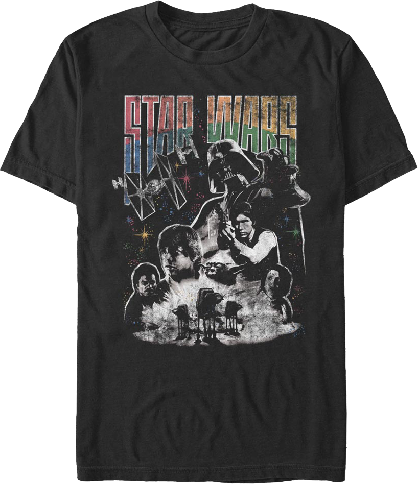 This Star Wars t-shirt features a collage of images from the 1980 classic The Empire Strikes Back. The collage shows TIE fighters, Darth Vader, Lando Calrissian, Luke Skywalker, Yoda, Han Solo, Princess Leia, and AT-AT walkers.