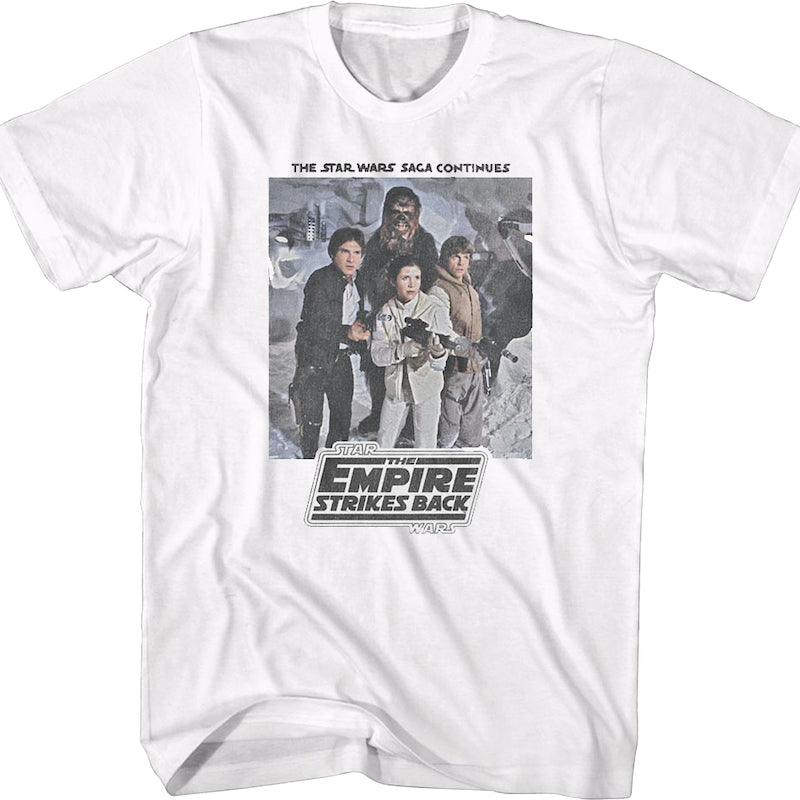 This Star Wars t-shirt shows Han Solo, Chewbacca, Princess Leia, and Luke Skywalker in a film still from the 1980 blockbuster The Empire Strikes Back. The shirt includes the tagline, "The Star Wars saga continues."