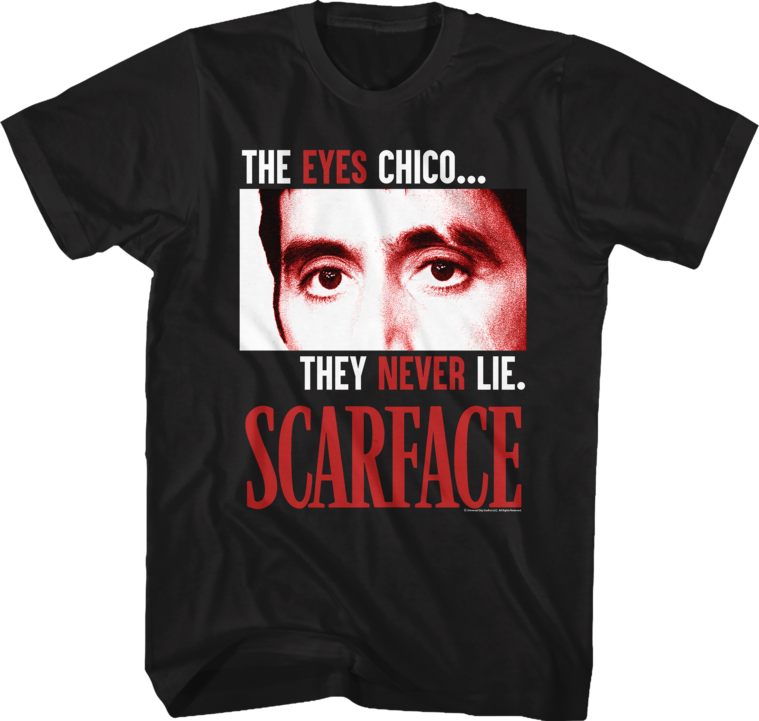 This Scarface t-shirt features a close-up of Tony Montana's eyes. The shirt includes Tony's famous quote, "The Eyes Chico...They Never Lie."
