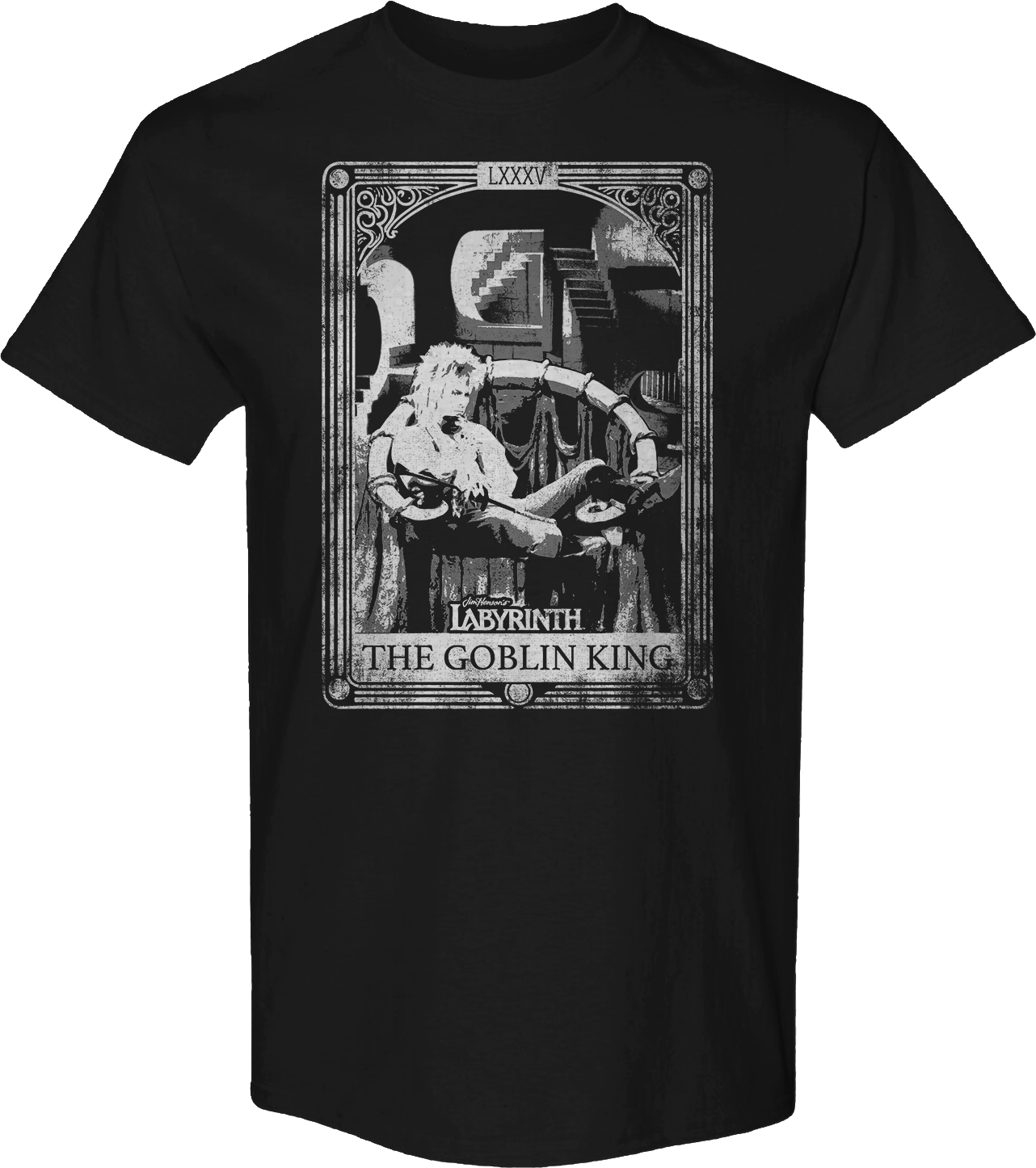 This Labyrinth t-shirt features a black and white image of Jareth, the powerful and manipulative king of the Goblins.