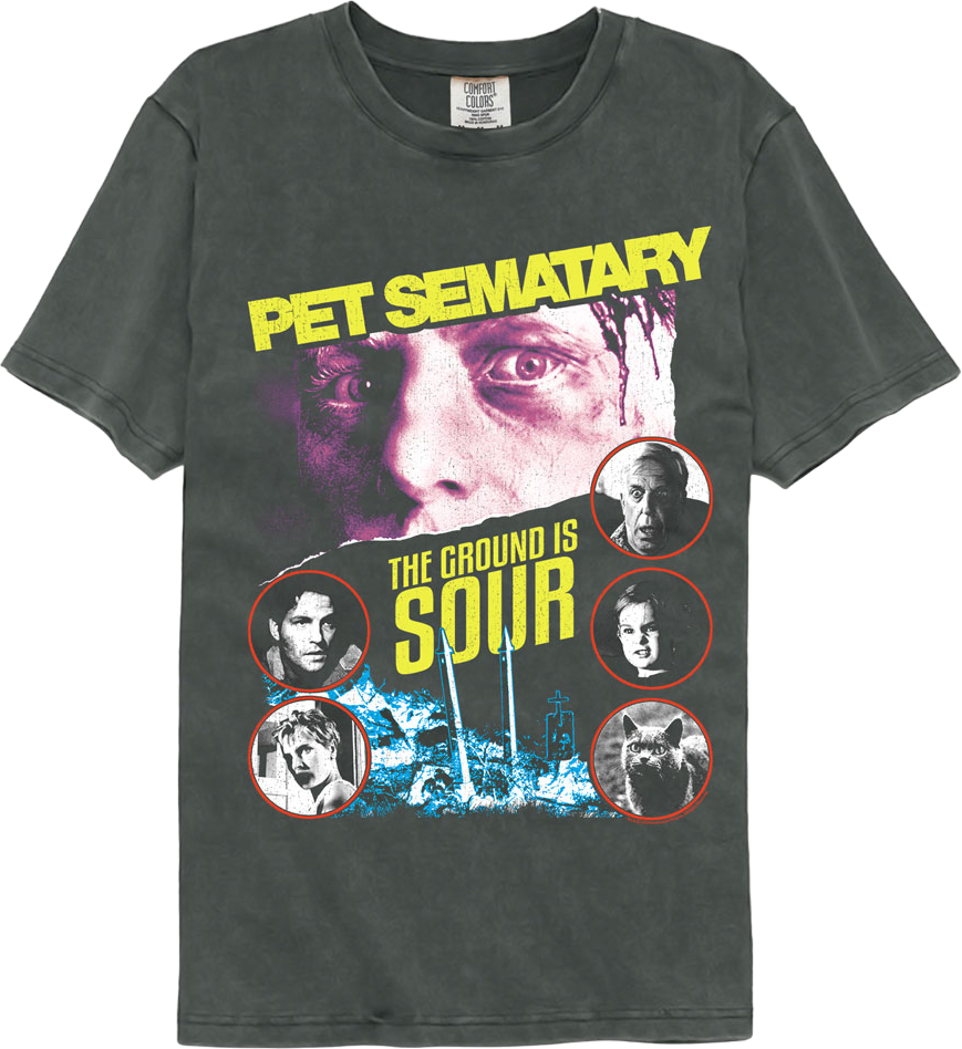 This Pet Sematary t-shirt features the movie poster and images of the characters Louis Creed, Rachel Creed, Jud Crandall, Gage Creed, and Church the cat. The shirt includes the tagline "The Ground Is Sour."