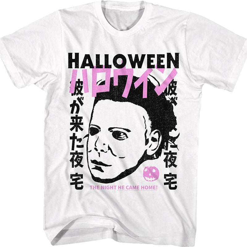 This Halloween t-shirt features Michael Myers' iconic mask and the movie's title in Japanese text. The shirt includes the Halloween tagline, "The Night He Came Home!"