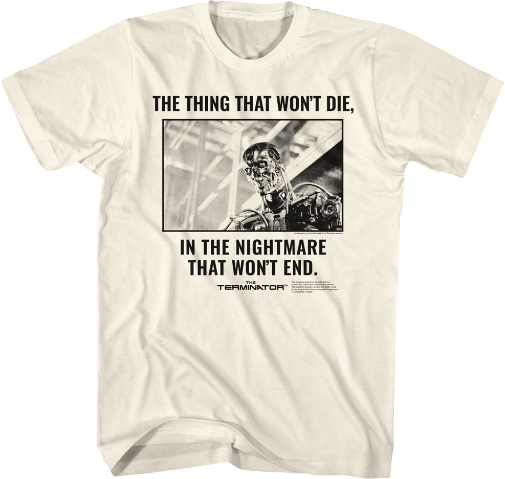 This Terminator t-shirt shows the metallic endoskeleton of the T-800. The shirt includes the tagline "The Thing The Won't Die, In The Nightmare That Won't End."