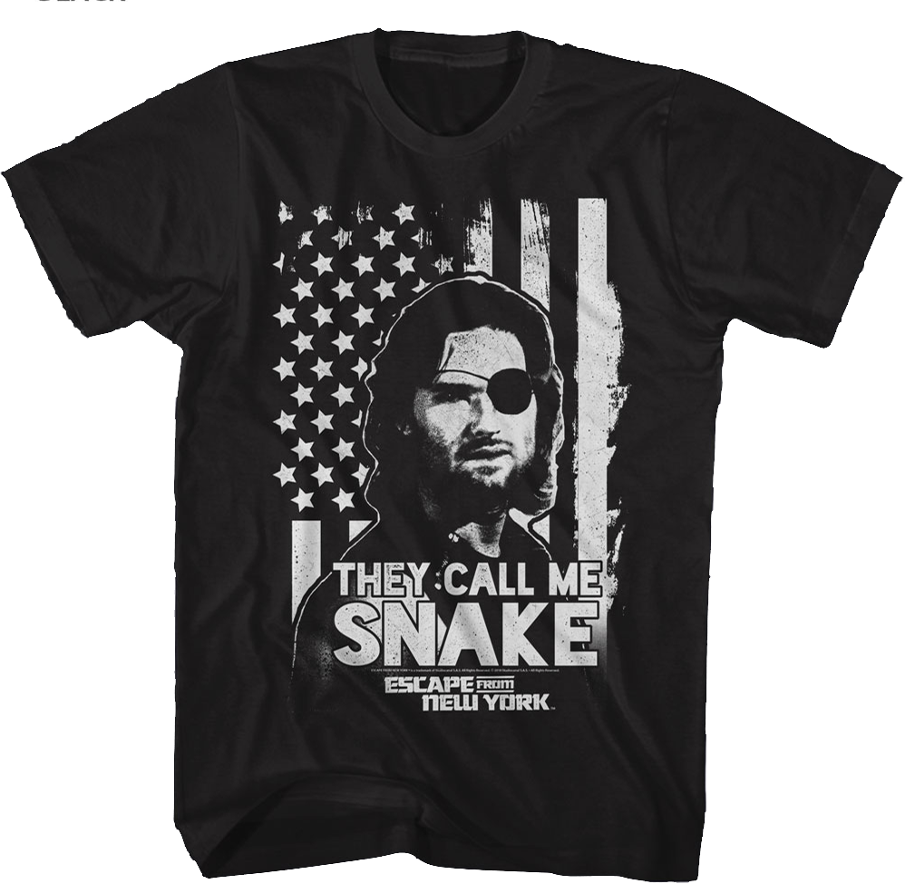 This Escape From New York t-shirt shows Snake Plissken posing in front of an American flag. The shirt reads They Call Me Snake.