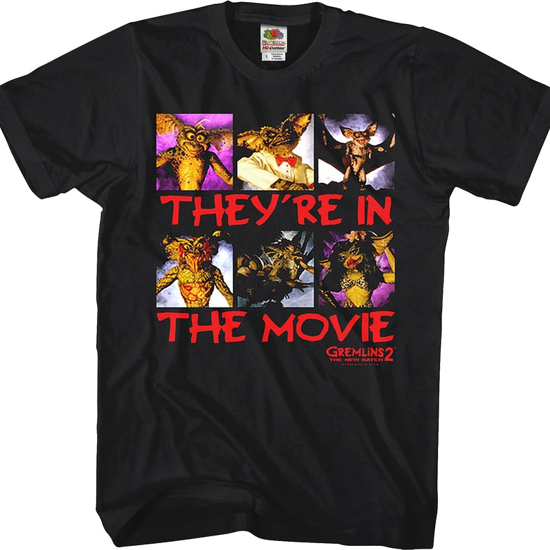 Here they grow again! This Gremlins t-shirt features the second batch of mogwai that spawned directly from Gizmo. The shirt reads They're In The Movie.