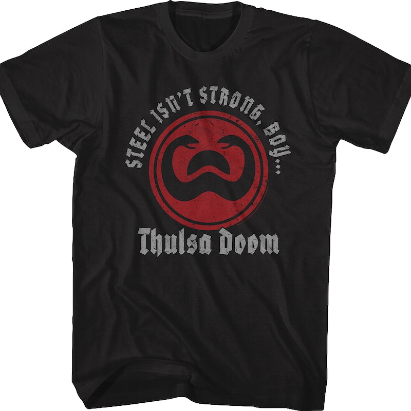 Thulsa Doom was a Stygian whose power as a strong and renowned wizard placed him as the leader of a snake cult. In the 1982 movie Conan The Barbarian, Thulsa Doom said to Conan, "Steel isn't strong, boy, flesh is stronger". After coaxing a girl to jump to her death from the Mountain of Power, Thulsa Doom asked, "What is steel compared to the hand that wields it?"