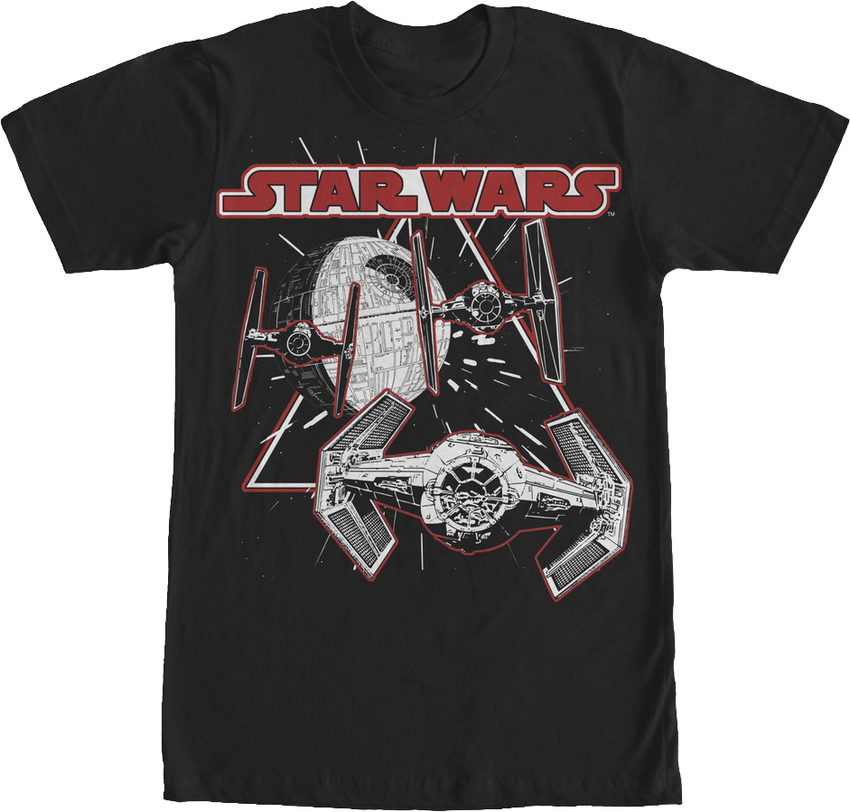 This TIE Fighters Star Wars T-Shirt features three TIE Fighters flying close to the Darth Star under the movie's logo. The Twin Ion Engine Fighter is the signature starfighter of the Galactic Empire. The TIE Fighter is one of the most instantly recognizable weapons from the Star Wars franchise.