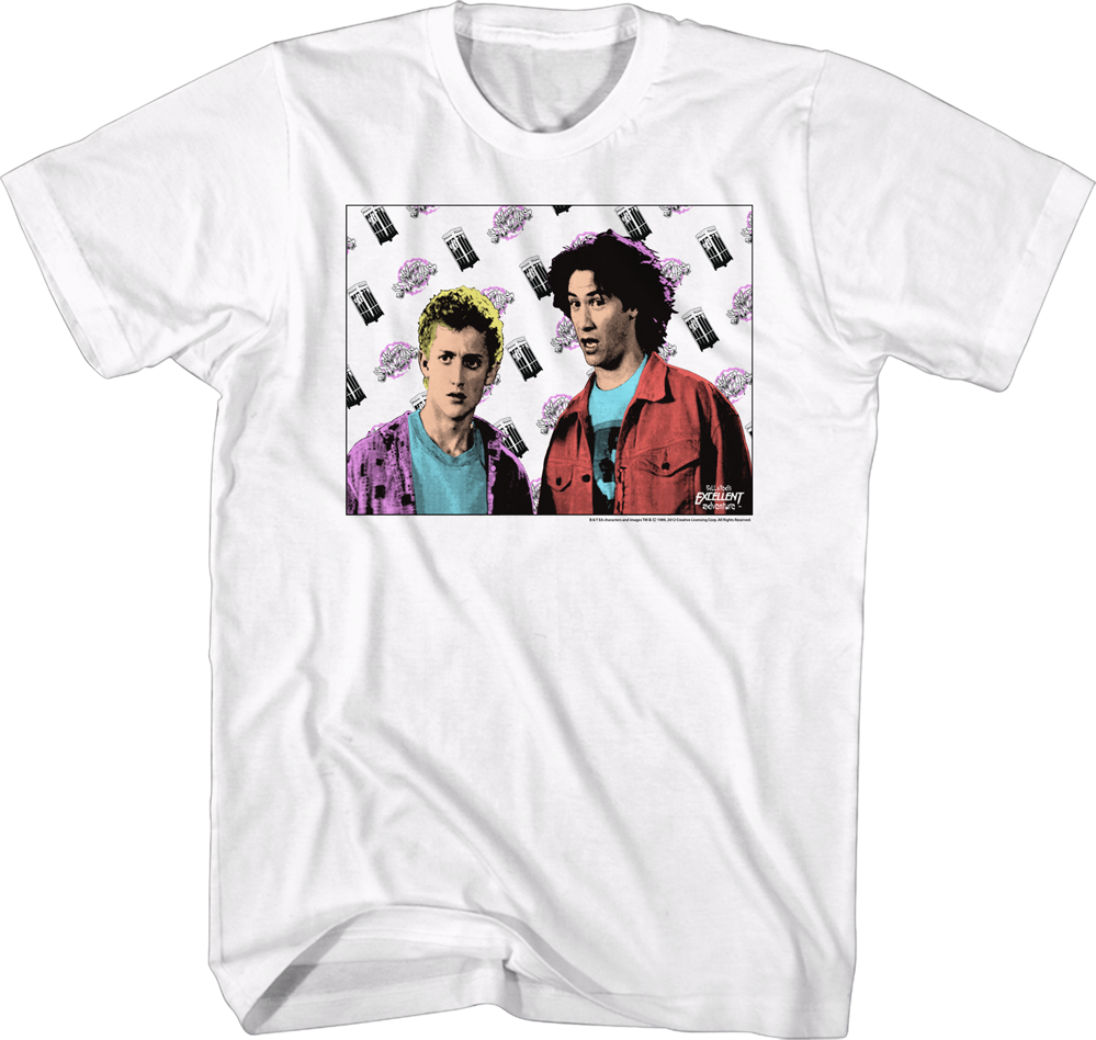 This Time Flies Bill and Ted's Excellent Adventure T-Shirt features a pop-art picture of Bill Preston and Ted Logan, the two lead members of the most triumphant rock band, Wyld Stallyns. The background shows flying telephone booths and the logo for their bodacious band. These two friends took a most excellent trip through time and kept us laughing along the way.