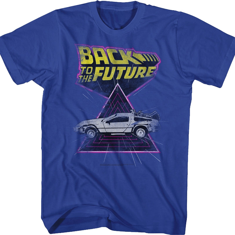 This retro-looking Back To The Future t-shirt shows one of the most popular cars in cinematic history, Doc Brown's time traveling DeLorean.