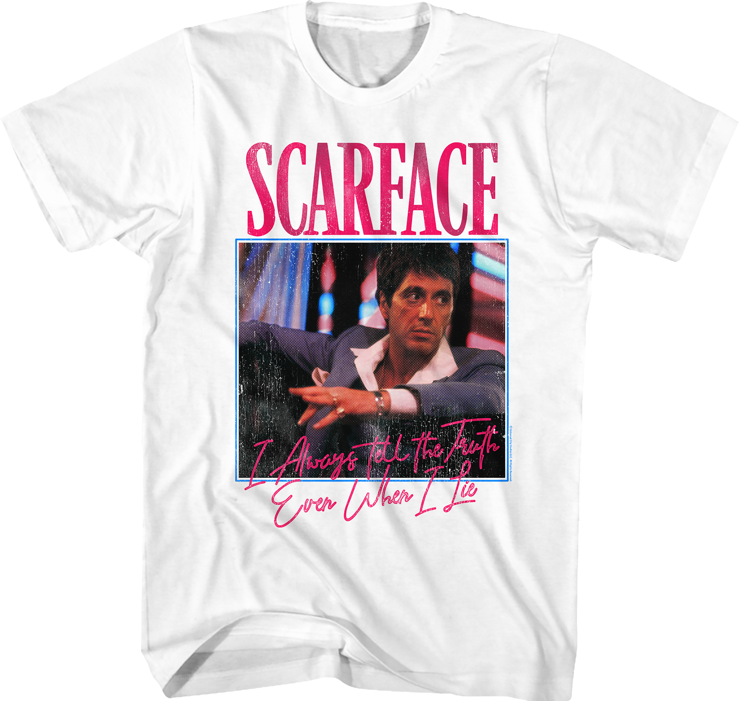 This Scarface features a framed picture of Al Pacino as Tony Montana. The shirt includes the classic quote "I Always Tell The Truth Even When I Lie".