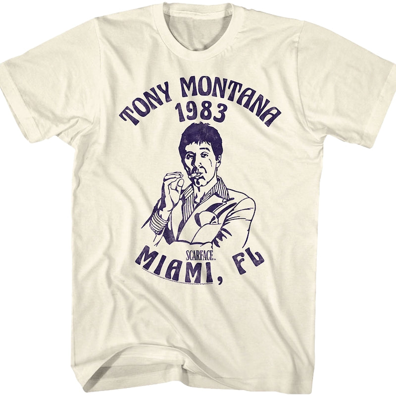 This Tony Montana 1983 Scarface T-Shirt features a sketch of Al Pacino wearing a suit and smoking a cigar. The shirt shows his name, the year 1983 when the film was released, and Miami, FL. In Scarface, Tony Montana was a Cuban refugee who paid for his green card with murder. He soon rose to infamy as a powerful crime boss.
