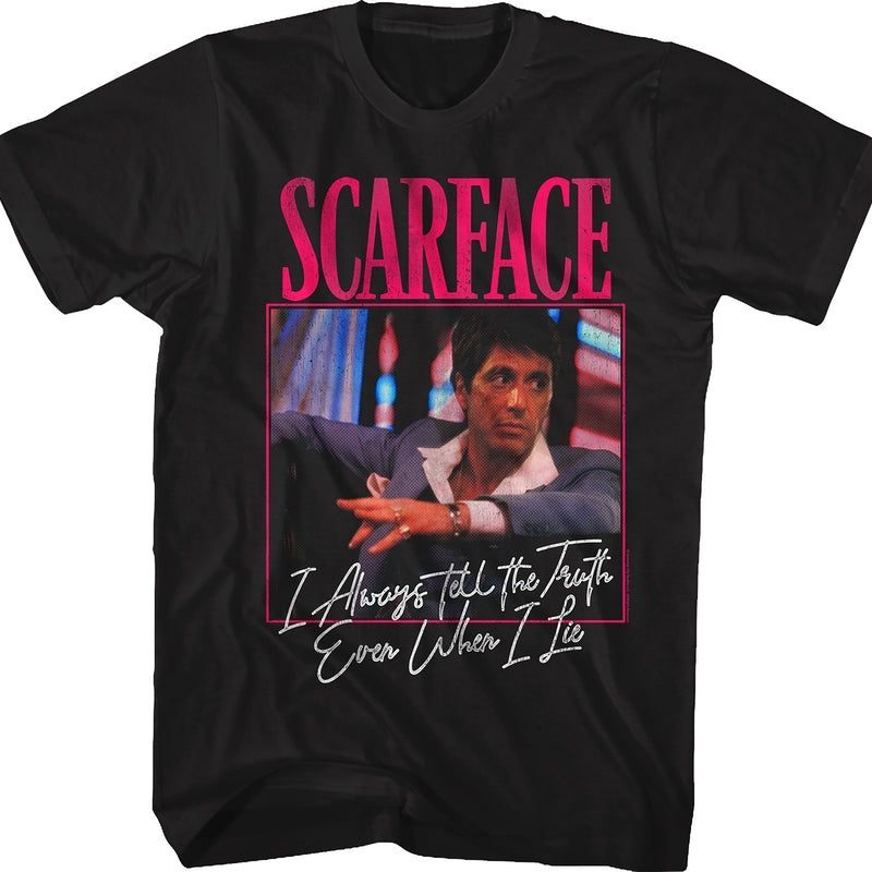 This Scarface features an image of Al Pacino as Tony Montana. The shirt includes the classic quote "I Always Tell The Truth Even When I Lie".