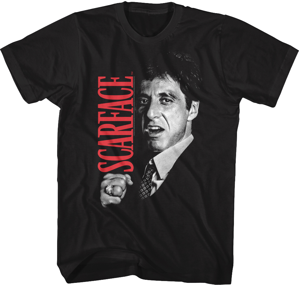 This Tony Montana Fist Scarface T-Shirt features a black and white image of Al Pacino with the movie's title. In Scarface, Tony Montana was a Cuban refugee who came from nothing and rose to become a violent and powerful drug kingpin. Tony Montana became one of the most iconic characters in cinematic history!